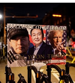 A poster showing Elon Musk, Yoon Suk Yeol, and Donald Trump, found near Yoon’s residence in January 2025.